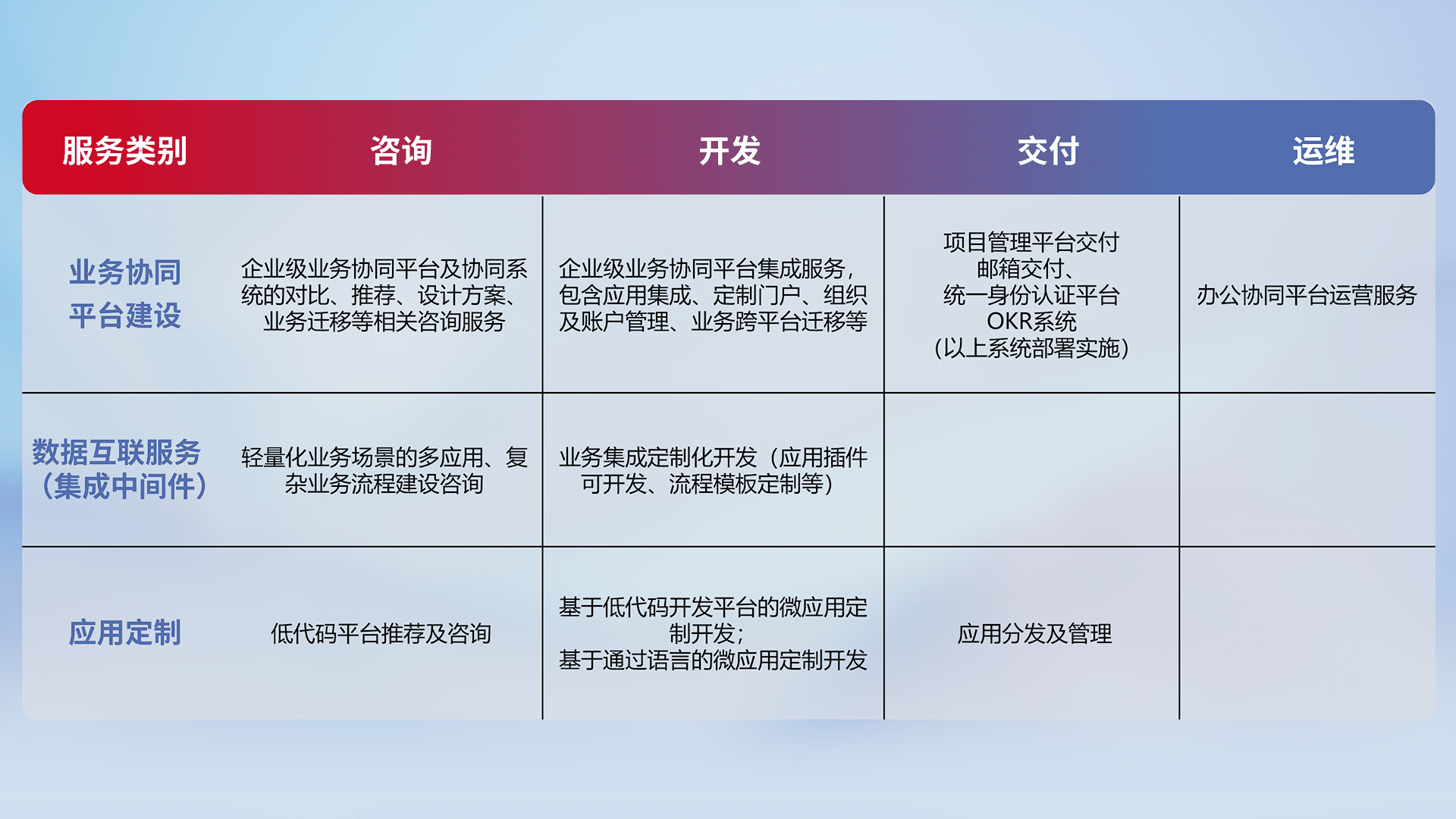 针对钉钉、、企微、、IDaas等平台级产品提供产品的规划、、、方案、、、交付、、定制化开发等服务,,,,实现如统一协同办公、、、智能客户服务、、混合会议管理、、、、智能数据查询、、、等业务场景,,实现数字化转型。。。。