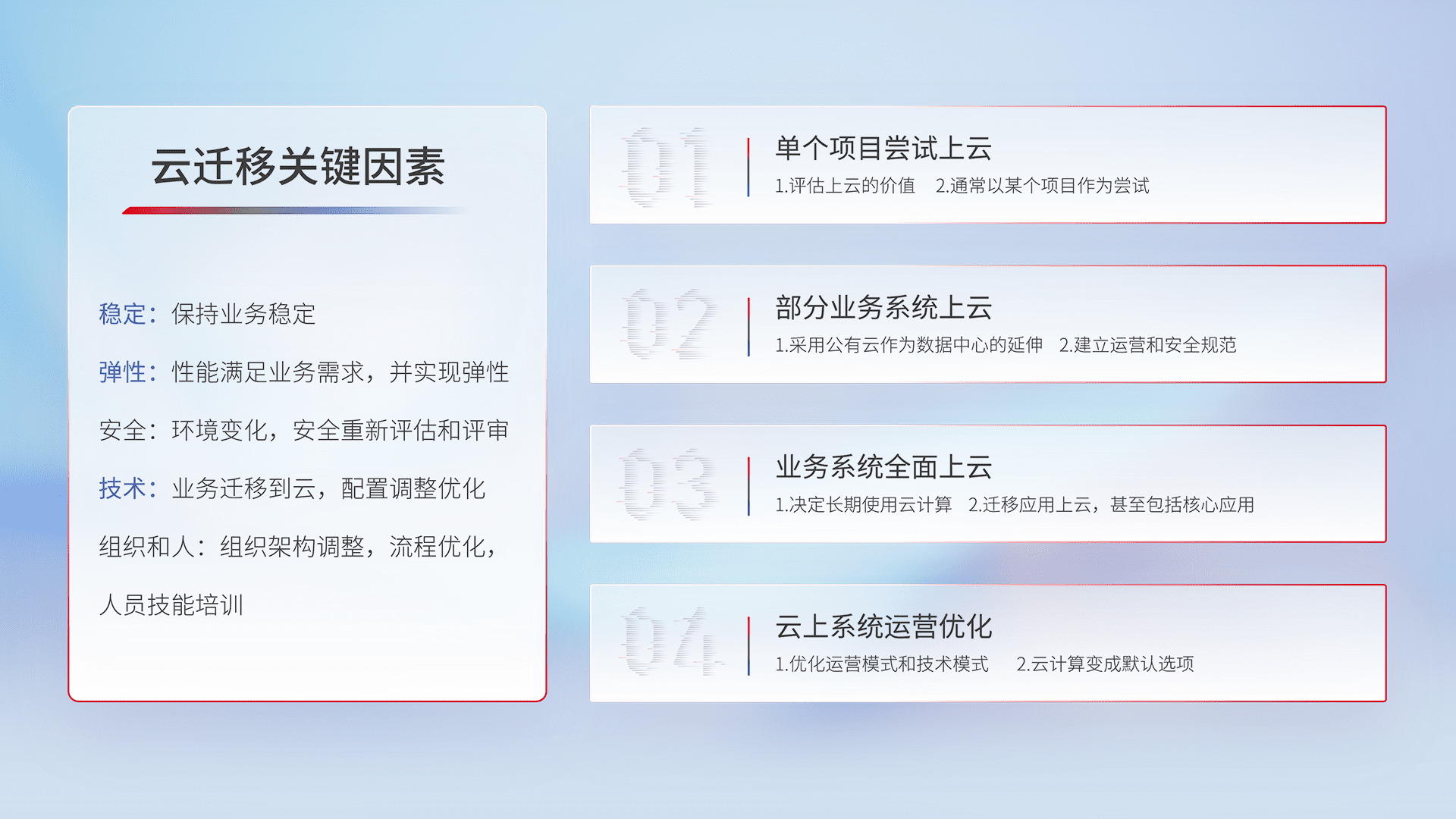 结合实际业务,,,从规划设计、、云平台选型、、、、云原生改造、、数据迁移、、、、集成交付,,,,迁移全过程为客户识别最佳上云路径,,,做好风险识别管理,,设计网络架构、、身份权限、、安全审计合规、、、操作审计、、、日志审计、、、、监控告警策略、、、、多站点容灾设计等,,,,对云上基础设施进行整体规划,,,提升IT治理水平,,以满足弹性、、、高可用、、高性能的需求。。。。